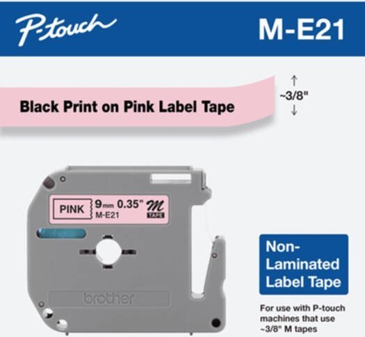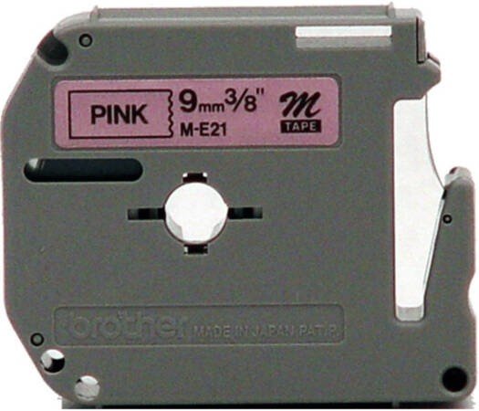 Genuine Brother non-laminated label tape with black text on a pink background. Designed for Brother Ptouch label makers, it produces clear, high-contrast labels for indoor use. The tape is 9mm wide and 8m long.