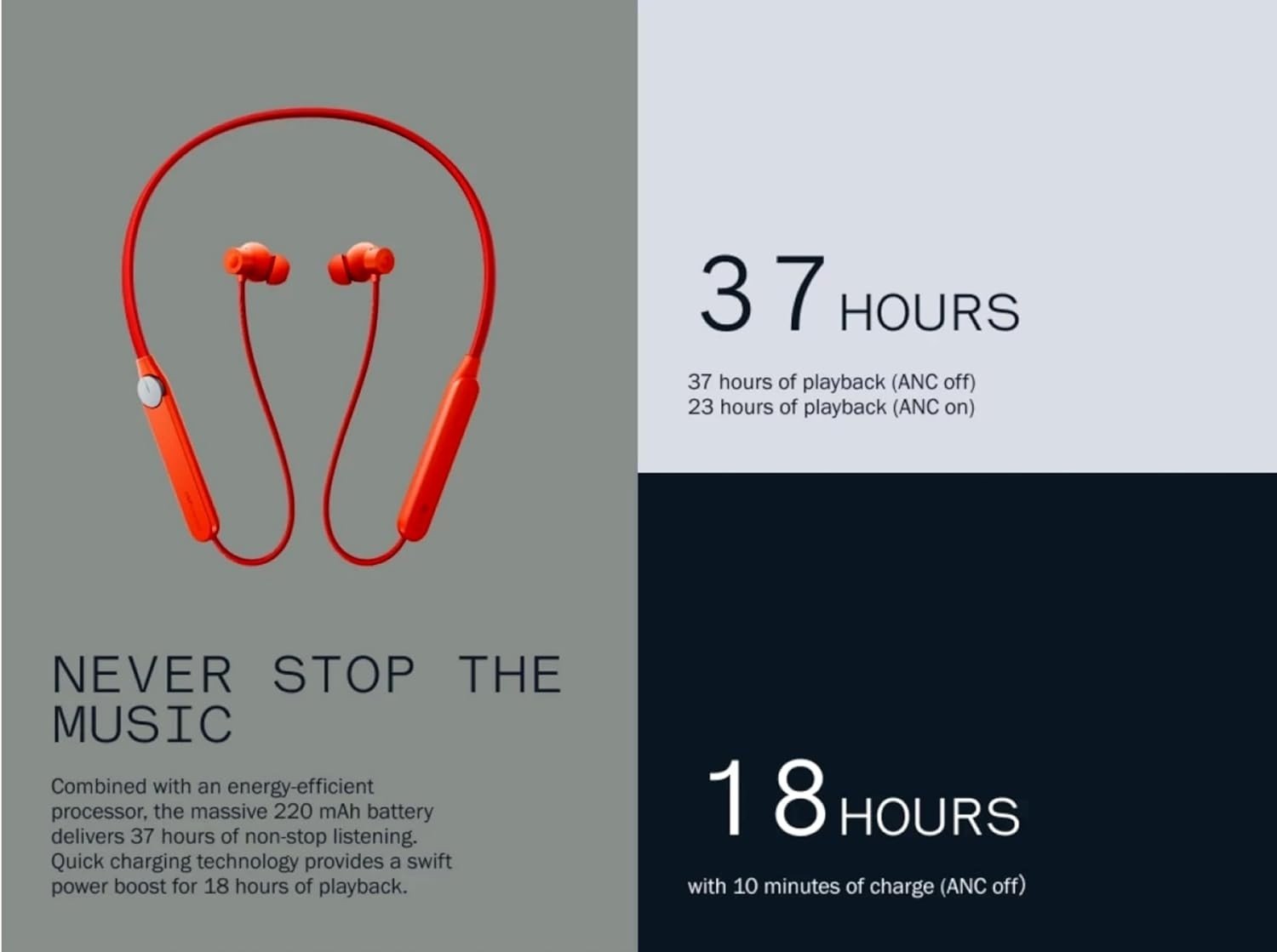 - Capacity: 220mAh || Battery life:- Playback (50% volume), ANC off - 37 hours of playback, ANC on - 23 hours of playback, Transparency mode - 22 hours || Talk time (50% volume), ANC off - 20.5 hours, ANC on - 18.5 hours, Transparency mode - 19 hours Fast Charge:- ANC off - 10 min charge for 18 hoursANC on / Transparency mode - 10 min charge for 11 hours playback.