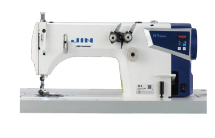 The Jin H1W-364A is a heavy-duty 3-needle double chainstitch sewing machine equipped with a rear puller for consistent feeding and smooth operation on heavy or multi-layered fabrics. Perfect for high-speed production of waistbands, side seams, and decorative stitching. Sold as a complete set with motor, table, and accessories.